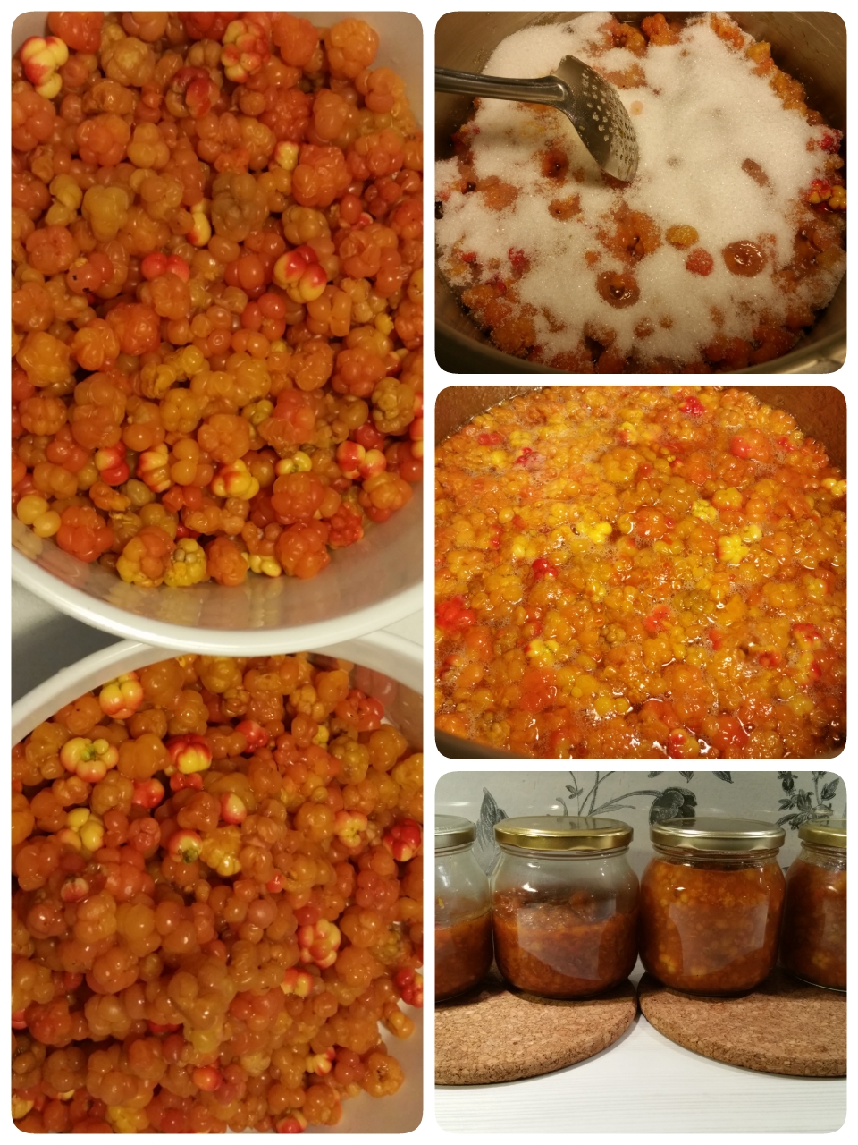 後來我跟餅乾哥哥一起做了云莓果醬。自從懷孕以來就愛上了吃鬆餅,總是嗜甜,斯堪維亞人喜歡吃鬆餅配上云莓果醬,這云莓因為比較稀有,所以一罐410克的云莓大概要價89克朗不等吧,雖然不是天價,但是比起普通的果醬是要貴了一些,而且市場上比較少看到。